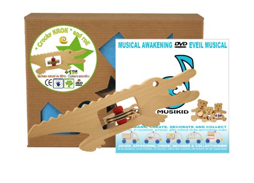 Crocodile en bois instrument de musique pour l'éveil musical. Accompagné d'un DVD d'initiation il permet à un adulte, SANS CONNAISSANCES MUSICALES REQUISES, de transmettre et de partager avec l'enfant les bases rythmiques de la musique. Le site internet Musikid, explique en quoi l'EVEIL MUSICAL est BENEFIQUE au DEVELOPPEMENT de l'ENFANT, à la confiance en soi, à la socialisation, à l'accès aux langues ... COFFRET PRESTIGE MUSIKID : Crocodile cymbalettes + DVD